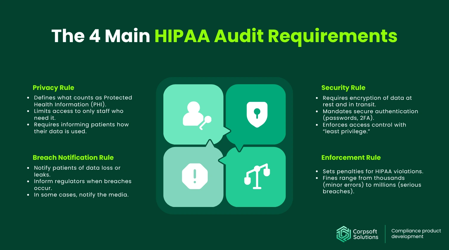It’s a U.S. law that regulates how exactly you should handle patients’ medical information (Protected Health Information (PHI)). The main goal of this regulation is to ensure the confidentiality, integrity, and availability of patient data. The four main HIPAA audit requirements are: